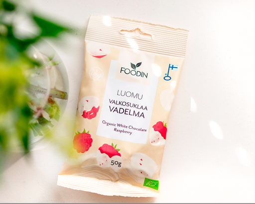 Katso kaikki tiedotValkosuklaavadelma, luomu, Foodin, 50 g