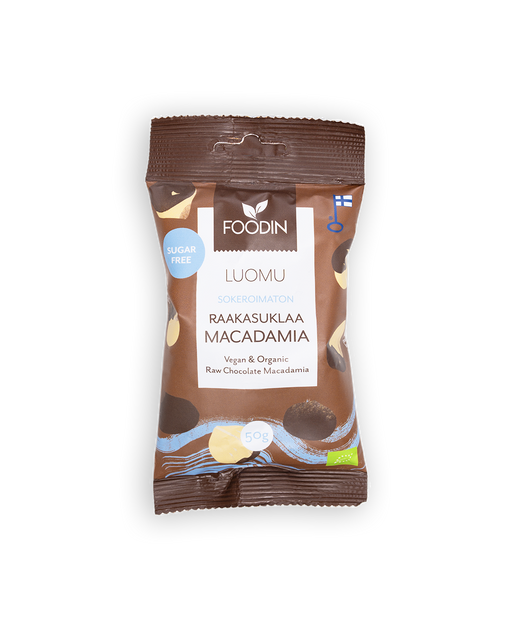 Katso kaikki tiedotRaakasuklaamacadamia, sokeroimaton, luomu, Foodin, 50 g