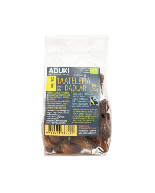 AdukiAurinkokuivattu luomutaateli hurmaa. Kuvaus Käyttö Ainesosat Taateleita auringon alta! Kivettömät taatelit hurmaavat makeudellaan. Adukin...
